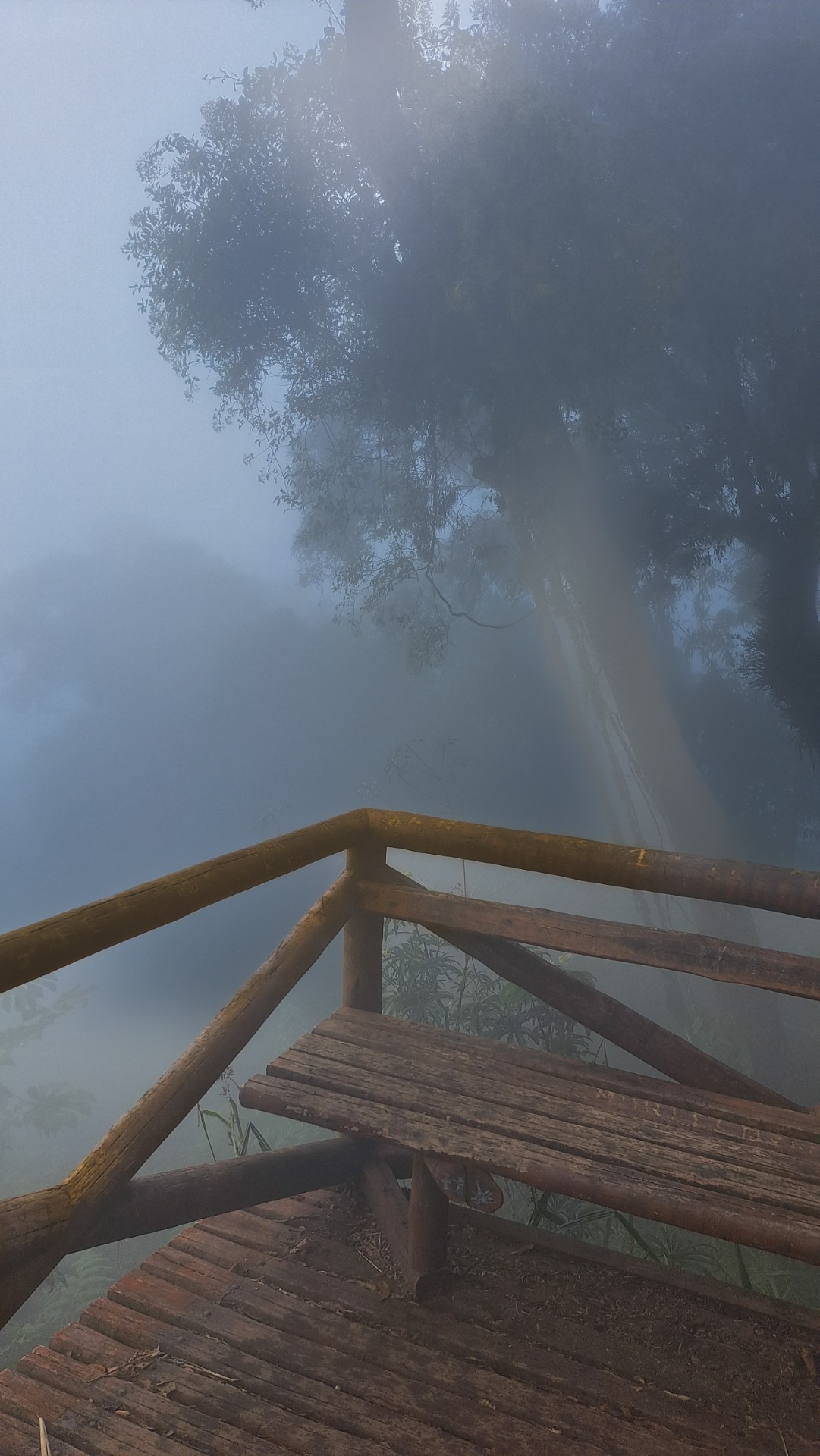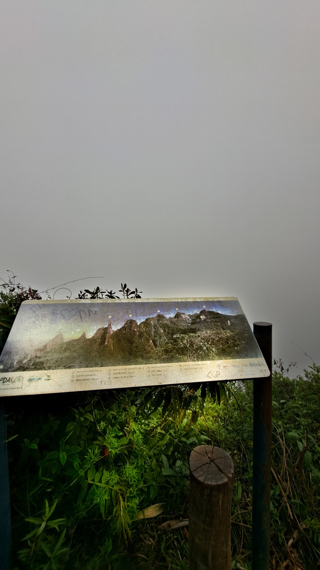 Na metade da subida, percebemos a chegada do nevoeiro, conhecido como "ruço" pelos moradores da Região Serrana. Ele cobriu toda a montanha e, ao chegarmos ao mirante, não havia vista alguma. Apenas nuvens.
