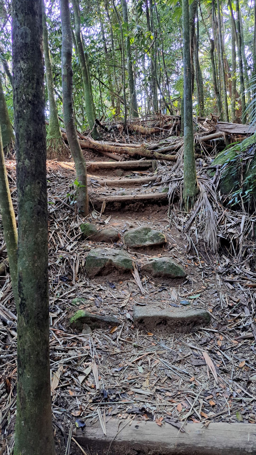 O trajeto é, basicamente, uma escadaria formada por raízes e troncos. Embora aumente a segurança, evitando escorregões, pode ser desafiador para pessoas com problemas articulares ou de locomoção.